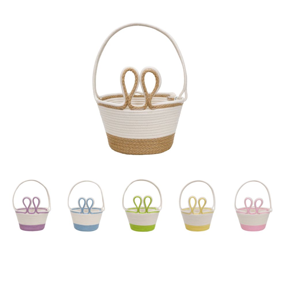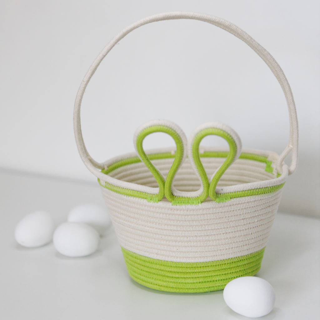 Hop into the spirit of Easter with our adorable Bunny Baskets! Handcrafted from 100% locally sourced cotton rope, these charming baskets bring a playful yet elegant touch to your festive décor. Designed with sweet bunny-ear handles in soft pastel hues, they make the perfect Easter gift, egg hunt companion, or stylish storage solution.